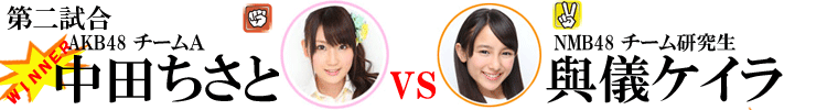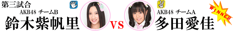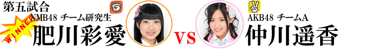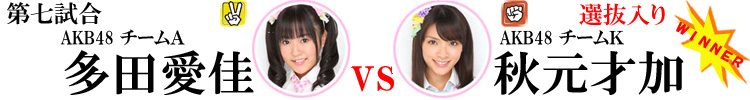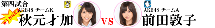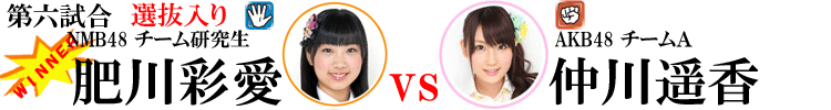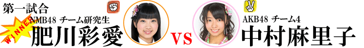 NMB48の予選会を勝ち進み、この日本武道館の本選チケットを手に入れた2名が登場!? そして、順調に勝ち進んだのは、NMB48研究生の肥川彩愛。見事選抜入り一番乗りだ!?これからの活躍に期待してみよう。 ついに、これまで全シングルの選抜に選ばれてきた今年の選抜総選挙第一位の前田敦子が秋元才加に負け、記録ストップとなり、その秋元が選抜入りを果たした!?。 これでAブロックからはNMB48肥川彩愛とAKB48秋元才加がセンターポジションを目指し対決する。