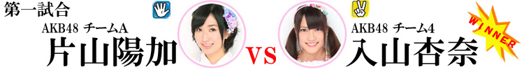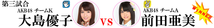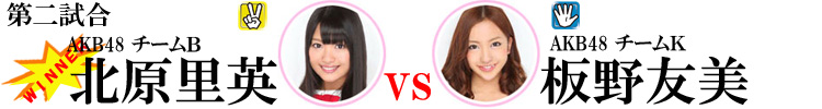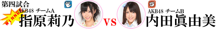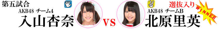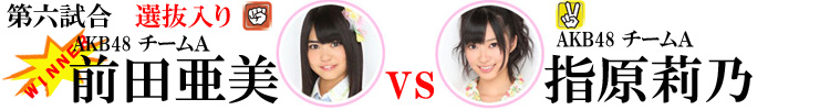 Hブロック 指原クオリティ このブロックの注目カードはやはり、前回じゃんけん大会優勝者チームK内田眞由美と去年のじゃんけん大会で一回戦目からその年の選抜総選挙第1位の大島優子を破り、次の対戦相手に負けるという指原らしい戦をし、今年の選抜総選挙で第9位に入った、さしここと指原莉乃の対決!?見事勝ったのは、さしこだー!?次なる対戦相手は、一回戦で大島優子に勝った、あーみんこと前田亜美との対戦。 そして、もう一人の選抜入りメンバーは、北原里英。以前、関西の番組『やかせて、ソーセージ』に出演したときに、チョキのプリントされたTシャツをもらい、今回なんとオールチョキで見事選抜入りを果たした。その日のブログでチョキTシャツを着た写メがのっていた。 |